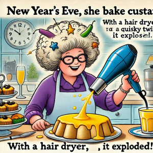 Oh, my Sherry made a resolution to bake custard. With a hairdryer for a quirky twist, it exploded!