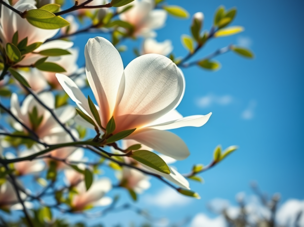 Beneath the sky, so blue and wide, The magnolia blooms with graceful pride. In its beauty, the world seems free, A moment’s peace, just you and me.